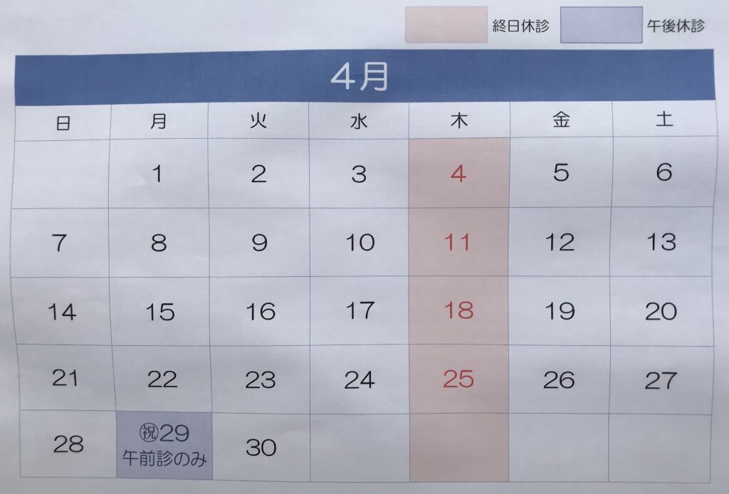 臨時休診の予定はございません。祝日の29日は午後休診 (午前9〜12時のみの診察となります)【4月の休診日】4日,11日,18日,25日,29日午後《休診日》木曜日、祝日午後※... -