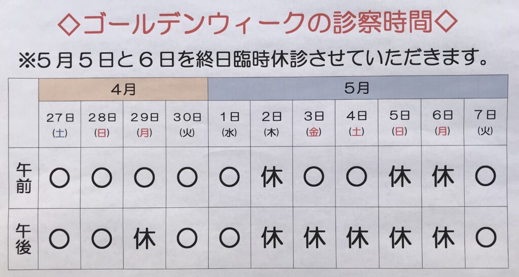 ゴールデンウィークの診察は下表のとおりです。 5月5日と6日は終日休診で、連休となります。 ※連休中、ほとんどのメーカーは休みます。お薬や食事がなくならないよう... -