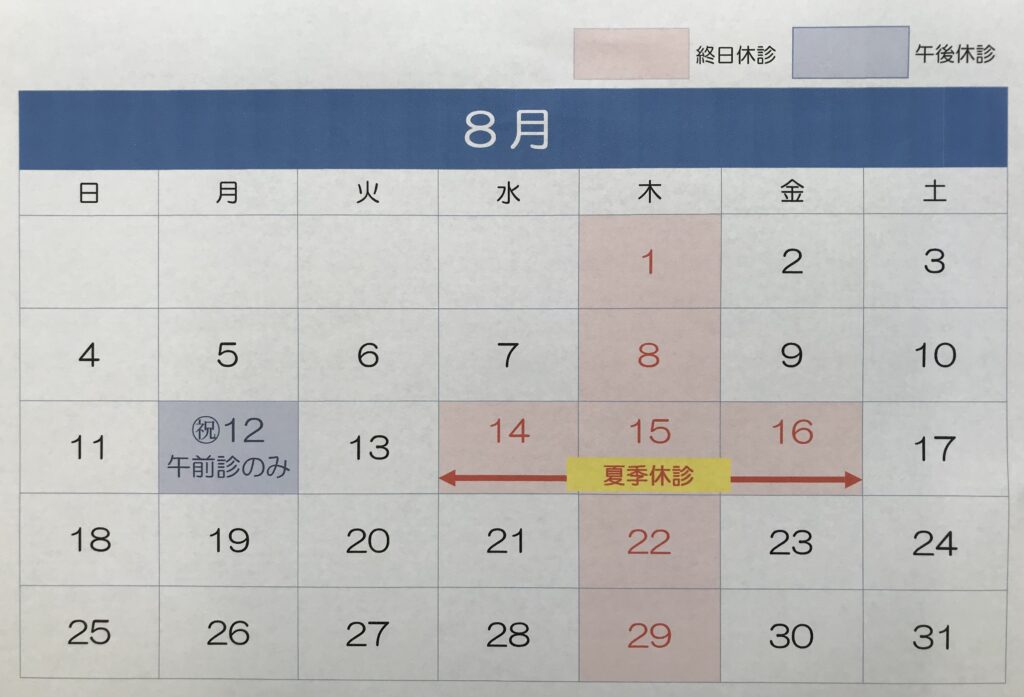 《夏季休診》14日・15日・16日を終日休診とさせていただきます。12日(祝月)は午前診察のみで午後休診です。※お盆の土曜・日曜日は通常どおり午前午後共に診察しておりま... -