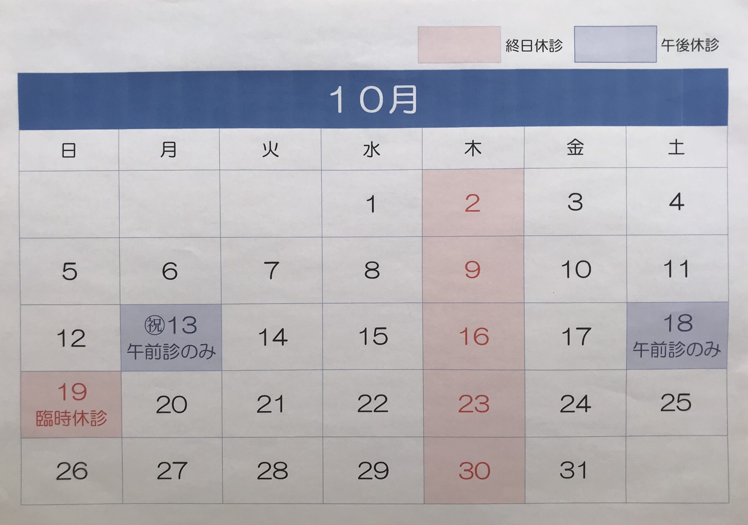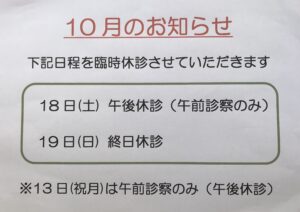 mondo-ah お知らせ 2025年9月26日 0 Comment 下記日程を臨時休診させていただきます。18日(土) 午後休診(午前診のみ)19日(日) 終日休診※13日(祝月)は午後休診。午前診察(9-12時)は通常どおり診察しております。《休診日》2日、9日、13日午後、16日、18日午後、19日、23日、30日